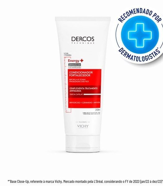 O Condicionador Fortalecedor Vichy Dercos Energy+ combate a rigidificação e reduz a queda devido à quebra e desembaraça instantaneamente, tornando o cabelo mais forte e minimizando o risco de partir. Ele nutre o cabelo e atua nas zonas fragilizadas dos fios para envolvê-los em um filme protetor que evita a perda de cabelo.
